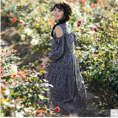 茵曼2018春装新款圆领露肩泡泡袖小碎花宽松连衣裙女