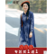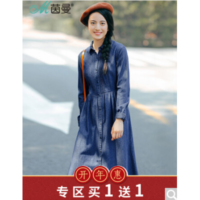 商品名称:茵曼秋冬翻领风琴褶腰带显瘦A摆牛仔连衣裙女
