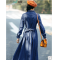 茵曼秋冬翻领风琴褶腰带显瘦A摆牛仔连衣裙女