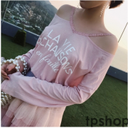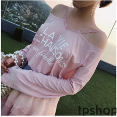 mimius璐璐新款ins花边长袖一字肩字母印花宽松T恤女两色M8258