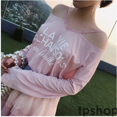 商品名称:mimius璐璐新款ins花边长袖一字肩字母印花宽松T恤女两色M8258