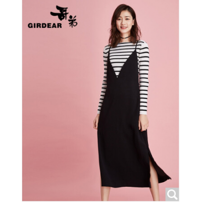 商品名称: 哥弟女装2018春季新款中长裙吊带V领连衣裙、