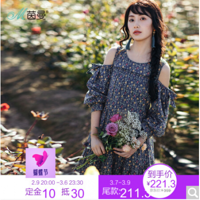 商品名称:茵曼2018春装新款圆领露肩泡泡袖小碎花宽松连衣裙女
